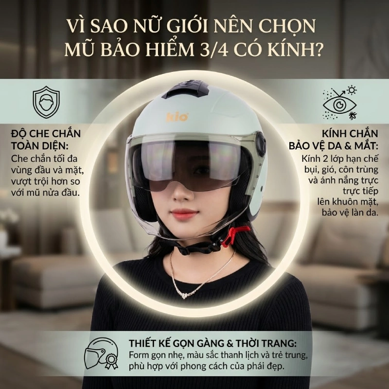 Vì sao nữ giới nên chọn mũ bảo hiểm 3/4 có kính?